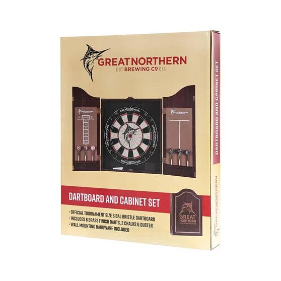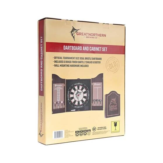 If you love sinking a beer on a Sunday arvo while playing a good old-fashioned game of darts, then the Great Northern Dartboard and Cabinet Set is for you. This is not your standard dart board as it features Great Northern design and logos, making it a fun piece to add to your deck or man cave. This dart board comes complete with 6 darts and is made from a strong MDF cabinet with bristle dartboard, so no matter how many darts you may throw at it over time you know it will last. Crack open a cold one, get the boys over and have a yarn while you play a round of darts.