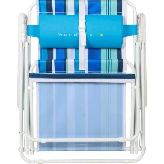 The Wanderer Summer Stripe Beach Chair is just the thing for spending a day at the beach or an outdoors event in comfort. The adjustable recline feature of this chair will ensure your comfortable all day long, plus the pillow can support either your head or your lumbar, whatever you choose. The handy mesh pocket on the back is perfect for your book or magazines. So if you are heading outdoors this summer and don’t want to sit on the ground this is a fantastic, compact and portable option.